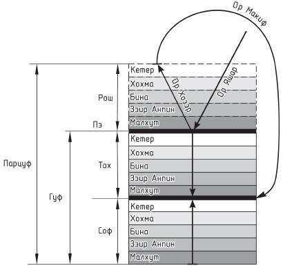 Когда же происходит исторжение света из гуф, то экран снизу постепенно поднимается от табур снова в пэ де-рош, как бы выталкивая свет из гуф. Парцуф до получения света в гуф имел в рош (в голове) информацию об этом свете, какое наслаждение есть в нем, каково желание парцуфа, какова сила сопротивления самонаслаждению.
