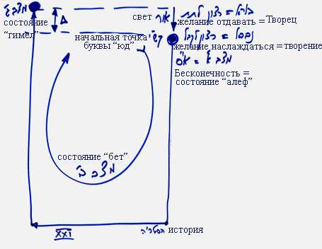 Начальное состояние в Бесконечности называется состоянием алеф. Весь этот кругооборот называется состоянием бет. Конечное состояние, которого мы достигаем, называется состоянием гимел. Поэтому весь этот кругооборот необходим только для того, чтобы прийти с уровня творения на уровень Творца.