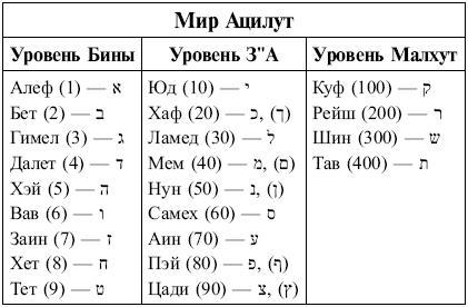 Мы изучали, что буквы находятся на уровнях Бина, З"А и Малхут мира Ацилут. На уровне Бина находятся буквы с первой по девятую, от Алеф до Тет. На уровне З"А находятся буквы с гематрией с десяти по девяносто включительно (имеется в виду гематрия, числовое значение буквы, в таблице приводится в скобках) – от Юд до Цади. На уровне Малхут находятся четыре последние буквы: Куф, Рейш, Шин, Тав.