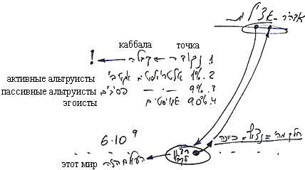 Пробуждение точки в сердце означает, что она превалирует над общим желанием, направляя его к достижении цели. Люди, у которых это происходит, чувствуют потребность в возвращении к корню и в итоге приходят к Каббале. А остальные, которые притягиваются не согласно точке в сердце, а в соответствии с желанием получать, устремляются к земным наслаждениям, к тому, что называется «этот мир». Эта категория людей, по словам Бааль Сулама, тоже делится на несколько групп. Часть из них - альтруисты, среди которых насчитывается 1% альтруистов активных и 9% пассивных. Остальные 90% населения являются эгоистами.