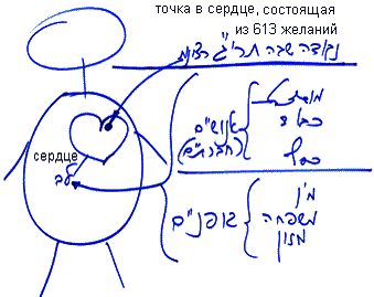 Итак, есть сердце и есть точка в сердце, так мы это называем – названия совершенно условны. Все человеческие желания – это сердце, а точка в сердце, это желание, находящееся над ним и направленное к Творцу. Это точка, состоящая из 613 желаний.