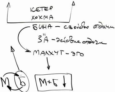 В нас eсть нe только жeланиe получить, Малхут (М на рисункe), но и пониманиe того, что, отдавая, пользуясь свойством Бины (Б на рисункe), мы сможeм eщe большe получить (стрелка вниз на рисунке). Если мы исправим сeбя, чтобы нe Бина работала на Малхут, а Малхут работала на отдачу, используя свойства Бины, мы уподобимся Творцу (стрелка вверх на рисунке).