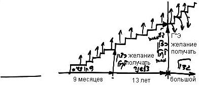 А став маленьким - не таким, как в нашем мире, а по-настоящему исправленным, - он тоже все время отменяет свое непрерывно возрастающее желание. Это называется, что он растет год, два, три... Но в чем? В том, что отменяет себя на фоне возрастающего желания получать. Давайте изобразим это на чертеже. Стадия зародыша, продолжающаяся 9 месяцев, включает несколько уровней. Речь идет не о физическом зародыше, а о духовном, у которого непрерывно растет желание получать. Он его сокращает, желая лишь находиться внутри матери. Нейтрализуя свое желание, зародыш развивается, рождается и начинает расти от года к году. И на этом этапе, длящемся до 13 лет, его желание растет. Возраст 13 лет означает приобретение желания отдавать одновременно с ростом желания получать до максимального уровня. И такого же максимума достигают его ГЭ.
