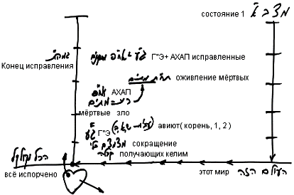 Нет, нет, у нас нет всех состояний. Мы говорим только о состоянии исправления, о состоянии 2. В человеке проявляются келим, и он определяет, с какими из них он может, а с какими не может работать, постоянно оставаясь в слиянии, в связи с Творцом. Келим, в которых он не способен удержаться в слиянии с Творцом, он сокращает, а те, в которых может это сделать, развивает. Развив ГЭ, он начинает ощущать свои получающие келим как мертвые, пустые, не способные и не годные к получению наполнения несмотря на то, что они являются истинной целью. Вместе с тем отношение к ним как к мертвым становится причиной понимания способа их использования. И тогда его отношение к ним называется оживлением мертвых. Он готов, получая дополнительные силы свыше, восстановить их так, чтобы эти желания вновь стали живыми, и он смог их использовать ради отдачи.