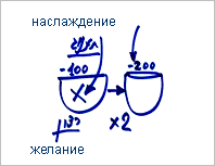 Мы изучали, что если желание насладиться хочет наполниться, - приходящее наслаждение гасит его, вместо того, чтобы наполнить. И в конечном итоге это желание остается еще более пустым – за счет наслаждения и за счет самого желания, т.е. если у человека было желание получить 100 г наслаждения, то теперь он остается с невосполненной потребностью -100 г, и таким образом его желание наполниться уже составляет -200 г.