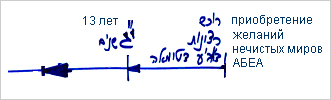 Давайте отметим на чертеже отрезок, который будет обозначать период в 13 лет. Человек начинает свою работу, приобретая в течение этого периода желания нечистых миров АБЕА.