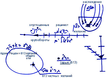 У любого человека, даже у самого маленького, есть 613 (ТАРЬЯГ) желаний. Причина этого в том, что все мы представляем собой общее кли - Адам Ришон. А поскольку Адам Ришон включает в себя 613 желаний, то и в любой его части (подобно тому, как это происходит на голографическом снимке) имеется 613 своих частных желаний.