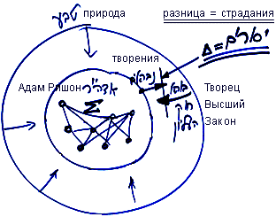 Мы знаем, что в системе миров первым идет мир Адам Кадмон (А"К), затем мир Ацилут. Адам Ришон был создан именно в мире Ацилут, поскольку мир Адам Кадмон – это просто Кетер, это как свет, который воздействует на нас. Родившись в мире Ацилут, Адам Ришон впоследствии разбился и достиг нашего мира, в котором существуют только животные тела, а от Адама Ришон в них осталась лишь точка в сердце.
