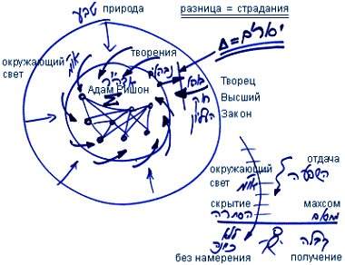 Короче говоря, нам еще предстоит понять смысл «прегрешения Древа Познания». Но суть в том, что Адам совершил ошибку, полагая, что сможет использовать ради отдачи келим, находящиеся ниже табура. У него это не получилось, и тогда все келим Гальгальта вэ-Эйнаим (Г"Э) и АХАП разбились и перемешались друг с другом.
