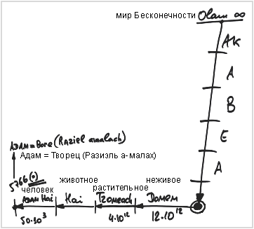 Существует закон, который гласит: «Поднимают в святости, но не опускают». Все творение из мира Бесконечности спускается в этот мир по духовным уровням: мир Адам Кадмон, Ацилут, Брия, Ецира и Асия. В процессе этого нисхождения, свет постепенно ослабляется, проходя через миры («олам» – мир, «алама» – скрытие), которые подобны фильтрам, ослабляющим свет. И самого низкого уровня достигает самый слабый свет, искра. И здесь происходит взрыв и начинается процесс создания нашей материи, нашего мира.
