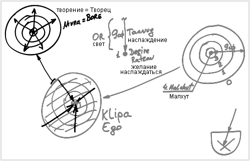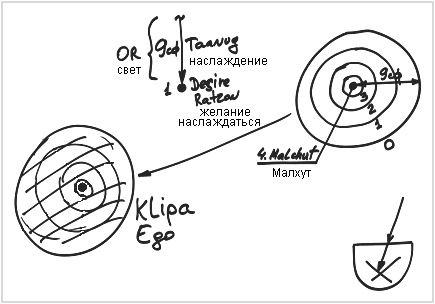 Творец использует все девять сфирот, все наслаждение, и с его помощью расширяет эту точку. И Малхут из точки превращается в огромное желание насладиться, включающее в себя все девять сфирот. Это называется клипа, эгоистическое желание, которое хочет все вобрать в себя.