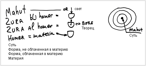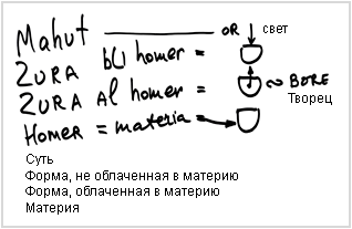 Существует материя (материал), форма материи, абстрактная форма и суть. Бааль Сулам приводит пример, в котором материя – дерево, а форма – стол. Абстрактная форма – это то, как мы себе представляем такое понятие как «стол». А что такое суть, мы не знаем, это нечто, находящееся за пределами любых форм, которые я могу себе представить.