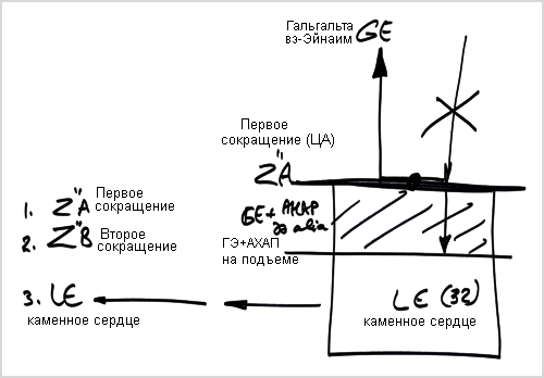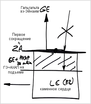 У меня есть желания, на все эти желания я делаю Первое сокращение и не использую их в эгоистической форме. Затем я пересматриваю все желания и отделяю желания, которые могут быть использованы. Используя их, я как бы отдаю, возвращаю Творцу свое наслаждение. Эта часть моих желаний, которую я использую ради отдачи, называется Гальгальта Эйнаим, к которой затем присоединяется АХАП на подъеме (АХАП дэ-алия). А кроме этого, существует часть, которую я использовать не могу, она называется «каменное сердце» – «лев а-эвен» и обозначается числом 32.