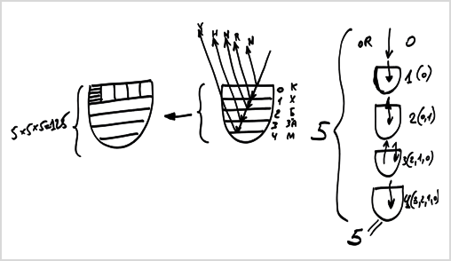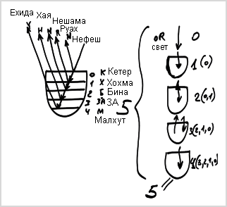 Свет – это нулевая ступень. А из чего состоит первая ступень? Из света, который находится внутри созданного им желания насладиться. То есть первая ступень включает в себя нулевую ступень, вторая ступень включает в себя нулевую и первую ступень, третья ступень включает в себя ступени вторую, первую и нулевую, и четвертая – третью, вторую, первую и нулевую ступени. Таким образом, последняя ступень включает в себя пять уровней.