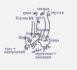 Часть кли, включающая нефеш, руах, нешама, называется внутренней, и ощущается им как его непосредственное тело. А другую свою часть кли ощущает внешней, ощущая в ней внешний окружающий мир, окружающую реальность. И когда человек раскрывает внешнюю реальность с помощью своего внутреннего кли, он раскрывает ее поделенной на части – это другие люди, животные, растительная и неживая природа.