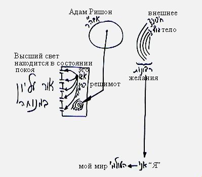 Будто у тебя есть некая коробка с пятью сенсорами, и ты задействуешь каждый орган чувств с помощью своего эгоистического разума. Перед тобой находится высший свет, пребывающий в абсолютном покое. А в тебе все время прокручиваются и обновляются неисправленные решимот – в каждое мгновение выскакивает какое-то новое решимо. Каждое такое проявляющееся в тебе решимо приходит к тебе от Адама Ришон, который заключал в себе всё мироздание, но упал. Ты же являешься частью этой конструкции – ее испорченным элементом, не связанным с общей системой.