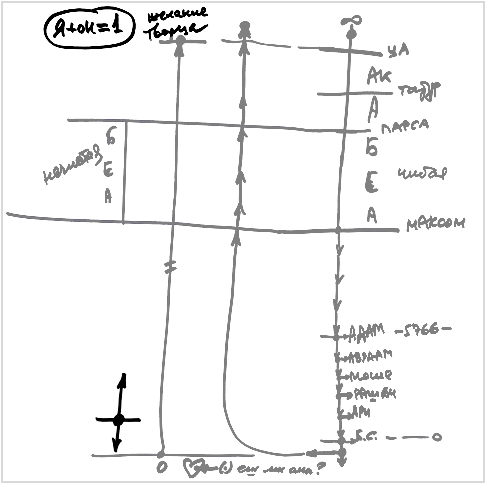 Человечество в течение сотен тысяч лет постепенно проходит все этапы развития эгоизма, пока не достигает абсолютной оторванности от духовного мира, от мира Бесконечности. Это развитие эгоизма проходит сверху вниз через экран, Цимцум Алеф, Адам Кадмон, Ацилут, Брия, Ецира, Асия, махсом и падает до нашего мира. Затем в нашем мире первый раз в эгоизме начинает проявляться альтруистическое свойство. Человека в этом состоянии мы тоже зовем «Адам», это произошло 5766 лет тому назад.