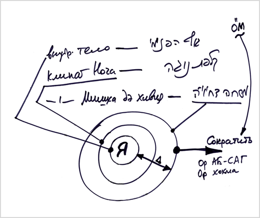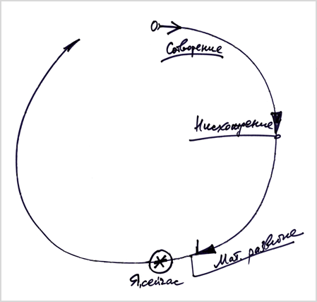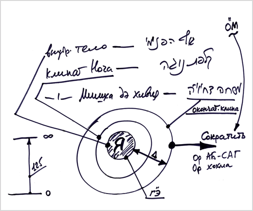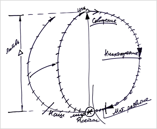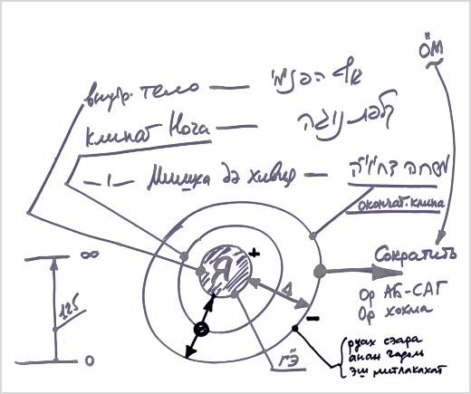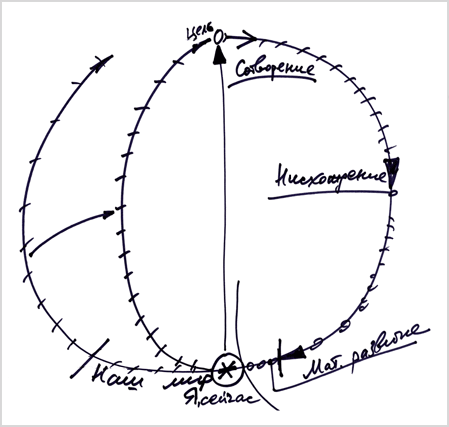 Человек должен себе вообразить, что он включен в замкнутый цикл, находится в начале нисхождения, то есть в каком-то месте, где в момент творения было начало его души, потом произошло ее нисхождение, вплоть до материального развития, и теперь он находится в нашем мире (на рис. «Я, сейчас»). Человек уже прожил несколько жизней, пережил какие-то испытания и теперь начинает ощущать и осознавать себя. Он не знает, что было до его появления на свет, но люди, которые постигли весь этот цикл, рассказывают ему, что его «Я» зародилось в нулевой точке и проявилось затем в теле. И сейчас, находясь в теле, человек спрашивает себя: «Для чего я живу и существую?».
