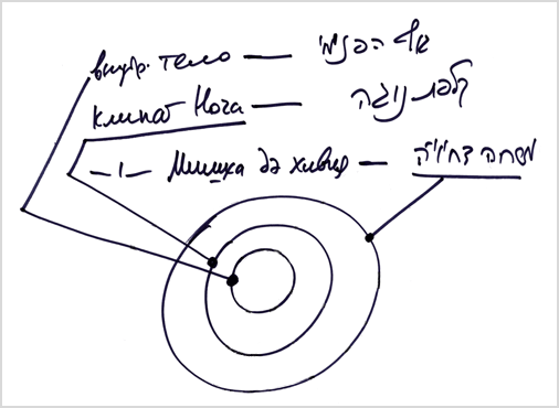 Когда человек определяет этим свое «Я», этим он выявляет свое чистое «тело», чистую душу – внутреннее тело. После выяснения, что такое клипа «Мишха дэ-Хивия» (на рисунке - «окончательная клипа»), у него остается очень интересная клипа - желания (ведь в нас ничего нет кроме желаний, желания – это вся наша суть). Остаются в нем такие желания, которые называются «Клипат Нога».