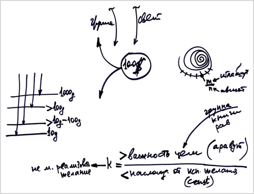 Я тысячу раз слышал о том, что курить вредно. Ну и что мне это дало? Ничего. Но у меня был период, когда я начал кашлять во время урока и не мог говорить. Я бы мог оправдаться: «Ну, что я могу сделать? Не будет урока». И тут нужно определить важность цели относительно наслаждения от использования желания. Соотношение между целью и наслаждением от желания должно иметь какой-то четкий коэффициент. Этот коэффициент должен быть положительным, причем большим.