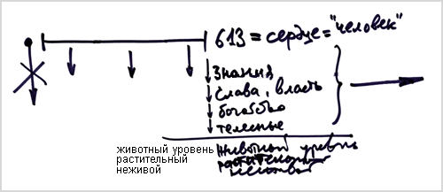 Например, раскрылось во мне какое-то решимо, есть в нем 613 желаний. Эти 613 желаний называются «мое сердце». Это то, что называется во мне «человек» сегодня. Естественно, это человек нашего мира, эгоистический, маленький. Что я могу сделать? Я могу эти 613 желаний начать в себе давить, то есть опускать их вниз.