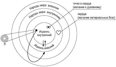 Есть бней-Исраэль, состоящие из внутренней части и внешней. Те, кто находятся внутри, понимают – ведь у них есть точка в сердце (желание к духовному). В тех, кто находится во внешней части, есть сердце (желание материальных благ) и проведена подготовка к проявлению точки в сердце, но эта точка пока не раскрыта (см. рисунок на стр. 100).
