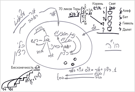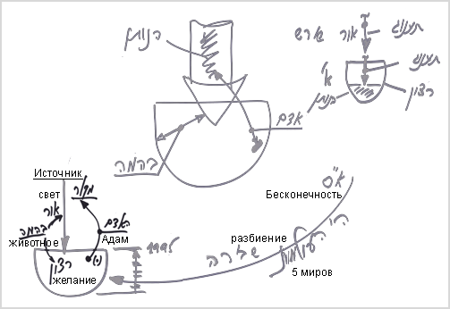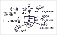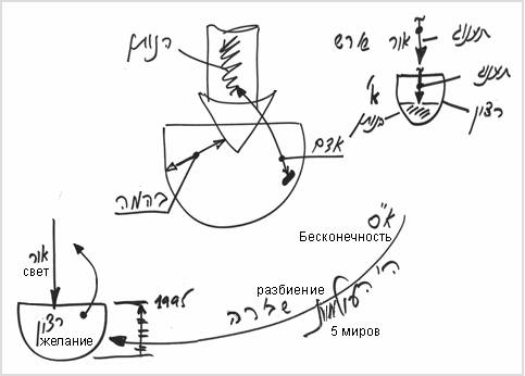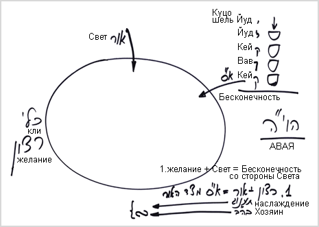Желание развивается, нисходя по ступеням шореш, алеф, бет, гимел, далет (от 0 до 5), которые соответствуют: конечной точке буквы йуд – йуд – кей – вав - кей, и так образуется кли. Это состояние, которое существует – больше ничего нет. Такое состояние называется миром Бесконечности, и оно представляет собой отношение света, Творца к созданному им желанию, «еш ми аин».