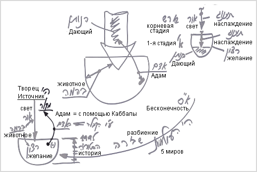Желание насладиться развивается через четыре стадии прямого света, распространяясь от мира Бесконечности сверху вниз. Ощущая «преимущество света из тьмы», желание, которое стоит против света, спускается через все ступени, проходя всевозможные состояния, и таким образом достигает осознания.