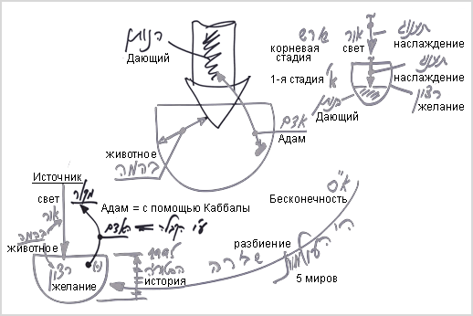 Мы созданы из мира Бесконечности, из точки «еш ми аин» как желание – желание насладиться без всякого рассуждения. А затем развивается разум вследствие того, что внутри желания раскрывается: от кого я произошел, откуда – то есть из первой АВАЯ, из которой развивается желание: шореш, алеф, бет, гимел, далет. Когда желание развивается, проходя все эти стадии, оно раскрывает: чего же оно хочет и почему, кто его создал, какой цели Он хотел достичь, создавая меня, чего хочу я в сравнении с тем, чего Он от меня хочет – того же самого или совсем другого?