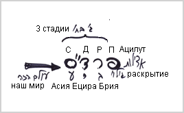 Так что вопреки мнению так называемых «хозяев», ведь, как известно, «мнение Торы противоположно мнению хозяев», мы считаем, что ПаРДэС начинается для всех с тайны, с непонимания категории внутреннего, сути истинной природы. Следовательно, порядок снизу вверх в нем следующий: сод, друш, рэмэз и пшат. Но в науке Каббала мы изучаем путь сверху вниз: пшат – это мир Ацилут, а рэмэз, друш и сод – миры Брия, Ецира, Асия. Мы же находимся в этом мире, ниже мира Асия.