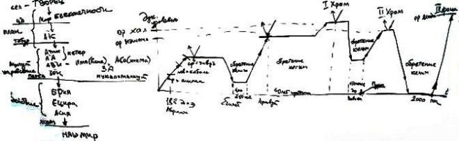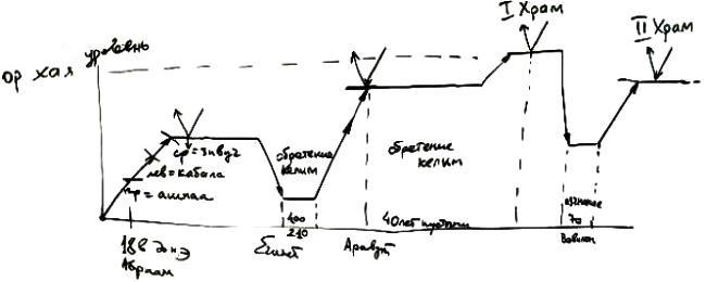 Рассмотрим это по диаграмме, в соответствии со временем. Авраам, начав с нуля, поднялся на определенный уровень (по времени это был 18-й век до нашей эры). Затем происходил дальнейший подъем – Ицхак и Яаков. Все они, в общем-то, поднимались по трем линиям, то есть Яаков уже делал зивуг дэ-акаа с келим дэ-каббала, потому что у него были: левая линия – это келим дэ-каббала, правая линия – это ашпаа, и средняя линия – это уже зивуг. И так они развивались далее, до изгнания в Египет.