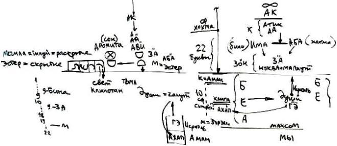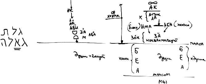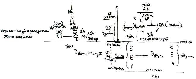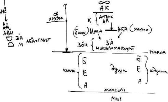 Итак, существуют: мир Бесконечности, АК, Ацилут. Ацилут – это Атик и АА (Кетэр), затем Има (Бина), Аба (Хохма); от Атик и АА идет свет к АВИ, от АВИ идет к ЗА-ну, от ЗА-на – его Нуква или Малхут, и затем – Парса.