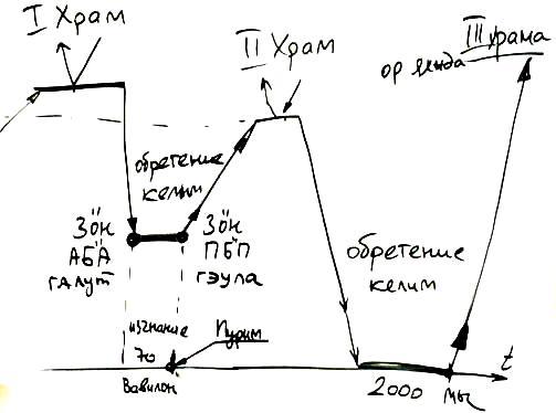 Затем следует разрушение этого Храма, 70 лет изгнания, Вавилон. Но это было изгнание относительное – на относительно небольшой уровень, не такое, как наше. После этого они возвращаются в Иерусалим, делают зивуг дэ-акаа и строят Второй Храм на уровне Ор Нэшама. И после этого начинается постепенный «галут» (изгнание), когда они сошли на самый низкий уровень – это то, что есть сегодня. И здесь находимся мы – все человечество, которое должно подняться до уровня Третьего Храма. Третий Храм – это Ор Ехида.