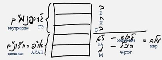 Три вида келим, относящиеся к Гальгальта вэ Эйнаим – кетер, хохма, бина – являются внутренними. Они могут быть полностью исправлены. А зеир анпин и малхут – это внешние келим, левуш (одеяние) и эйхаль (жилище). Впечатления во внешних келим называются моим миром, а внутренние келим – это я сам. Известно, что существует мир Ацилут и миры БЕА. Мир Ацилут ощущается в Гальгальта вэ Эйнаим, во внутренних келим, а миры БЕА – во внешних келим. При подъеме миров БЕА в мир Ацилут я получаю АХАП де-алия – дополнение из внешнего мира. А до этого у меня имеется только Гальгальта вэ Эйнаим.