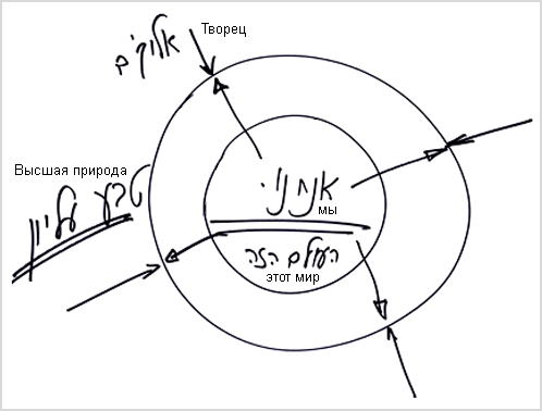 Существует источник, который называется мир бесконечности или «шореш» (корень). Подобно тому, как наша вселенная образовалась из некоего небольшого взрыва, и затем распространилась, так до возникновения вселенной существует место, называемое мир Бесконечности, из которого развиваются определенные силы. На этой стадии материи еще не существует, есть только силы. Они распространяются через пять миров: Адам Кадмон, Ацилут, Брия, Ецира и Асия. Это все еще поступенчатое нисхождение сил из мира бесконечности сверху вниз. Почему это называется нисхождением сверху вниз? Верх и низ на данном этапе еще не существуют, это всего лишь силовое поле. Но так как эта сила постоянно ослабевает, мы называем это нисхождением сверху вниз. Когда сила нисходит до последней ступени - мира Асия, то происходит взрыв. И таким образом возник этот мир.