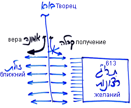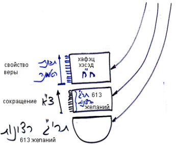 Мы с вами изучаем, что каково бы ни было состояние человека его кли всегда состоит из 613 желаний. Сейчас он приступает - я пока говорю чисто схематически – к этапам их исправления. Сначала он выстраивает все 613 желаний в порядке от легких к тяжелым с целью постепенно ввести их под сокращение, поскольку не хочет их использовать. Затем под воздействием Высшего света, а человек, разумеется, на каждом этапе работает только под Его воздействием, он приобретает во всех своих 613 желаниях свойство хафэц хэсэд, свойство веры.