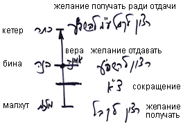 Продвигаясь по этим ступеням, человек сначала делает сокращение на получение. Затем он приобретает желание отдавать, называемое верой. А когда у него есть вера, то он может быть уверенным, что поступающее к нему свечение так исправит его получающие келим, что он сможет получать ради отдачи. Так что желание отдавать, или вера, или бина находится между, скажем, малхут - желанием наслаждаться - и кетером, т.е. желанием получать ради отдачи. И тогда кетер отдает, используя весь свой авиют.