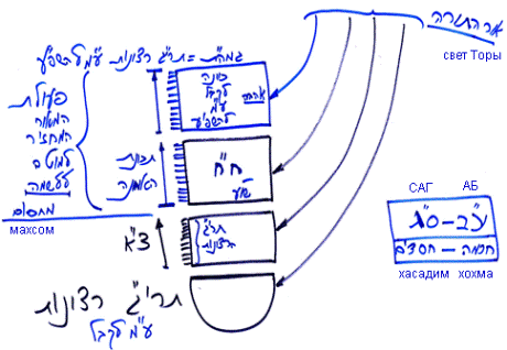 Границу, отделяющую эти ступени от предыдущих, можно назвать махсомом, выше которого человек начинает приобретать истинное лишма. Как правило, весь воздействующий на человека свет называется светом Торы. Но когда у него уже есть вера, то в зависимости от величины его намерения достичь исправления и стать отдающим этот свет помогает ему исправить желания. Его мы называем светом АБ-САГ: свет хохма в облачении света хасадим, в котором присутствуют все свойства, как веры, так и получения во имя отдачи, необходимые для нижних. И тогда это понятие, этот совершенный свет АБ-САГ исправляет творение.
