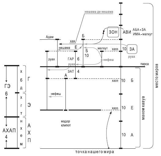 Итак, шесть сфирот – ГЭ мира Ецира находились на уровне малхут мира Ацилут (см. рисунок на стр. 63 – М), а четыре нижние сфиры мира Ецира (ЗАТ, на рис. – ЗА"Т) находились под парса, до хазэ постоянного мира Брия (на рис. «маком кавуа» – постоянное место). Мир Асия находился от хазэ мира Брия до хазэ мира Ецира (постоянных). Это то, что касается конструкции души Адама.
