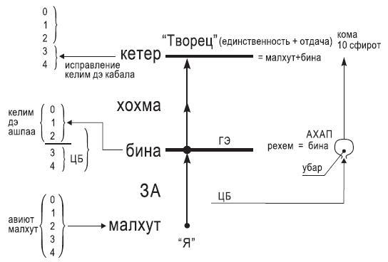 Рассмотрим детально: на месте Аба находился ЗА (см. рисунок на стр. 63 – АБА-З"А), на месте Има – малхут, нуква (на рис. – ИМА = малхут), на месте ЗА дэ-Ацилут (на рис. – ЗА) – Брия (на рис. – Б), на месте нуква дэ-Ацилут – ГАР дэ-Ецира (на рис. ГАР – ГА"Р, Ецира – Е).