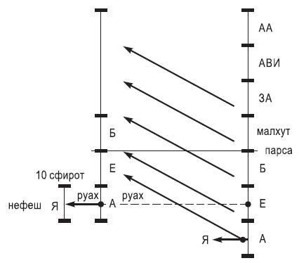 Вернемся к чертежу мира Ацилут (на стр. 63). Из миров БЕА (на рис. – Б, Е, А) Адам получал свет нефеш, руах, нешама – НАРАН. Кроме того, он получал дополнительный свет свыше от ЗОН (на рис. – ЗОН), которые поднялись в Аба ве Има (на рис. – АВИ). И от Аба ве Има через ЗОН к нему проходили света хая и ехида.