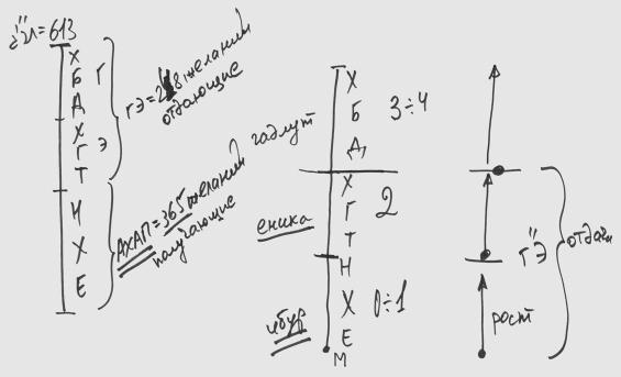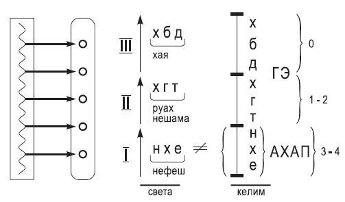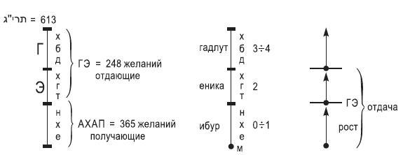 Отдающие келим – это ХАБАД-ХАГАТ (на рис. – ХБД ХГТ). А получающие келим называются НЕХИ (на рис. – НХЕ). Но когда мы говорим о процессе роста, мы говорим, что процесс роста начинается с НЕХИ, а потом ХАГАТ, а потом ХАБАД.