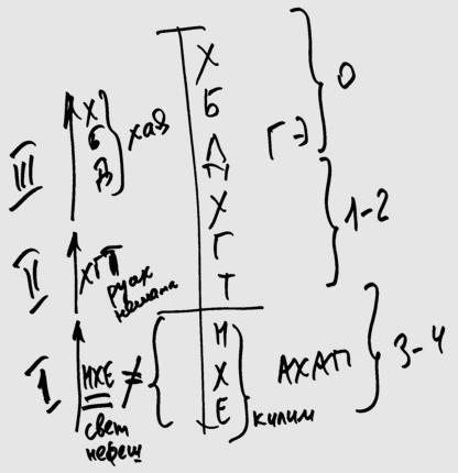 Мы растем наоборот. Мы сначала исправляем келим ХАБАД (на рис. – ), потом ХАГАТ (на рис. – 1-2), и только потом НЕХИ (на рис. – 3-4). А называется рост наоборот – НЕХИ, ХАГАТ, ХАБАД. Стадии – первая, вторая, третья (на рис. – I, II, III).
