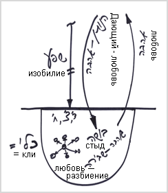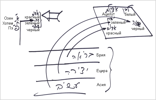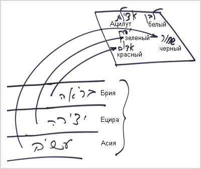 У меня, как будто бы, есть белый экран. Это мир Ацилут. Души поделены на 3 части – Брия, Ецира и Асия. Если души поднимаются из мира Брия, то все, что они себе представляют в мире Ацилут, проявляется им в красном цвете.