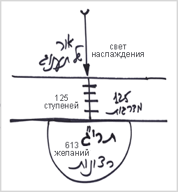 Сверху вниз изначально имеются 125 ступеней скрытия, ослабления светов. Для того чтобы ослабить света, существует система, которая называется системой миров. Но когда я начинаю принимать на себя эти 125 ступеней, впитывать, обрабатывать их, чтобы они стали 125 моими ступенями, когда я сам хочу этого скрытия, то они уже называются ступенями, а не мирами, сокрытиями. Это ступени постижения, раскрытия, и это те же самые этапы скрытия. Если я продолжаю скрывать свое желание, то на этом фоне раскрываю Управление.