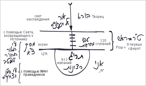 Поэтому никогда не наступит раскрытие Управления преждевременно. Есть свет, действующий со стороны Творца, и есть твое кли, включающее ТАРЪЯГ, 613 желаний. Но свет, наслаждение не может войти в кли напрямую. Между ними лежат все 5 миров, все 125 ступеней.