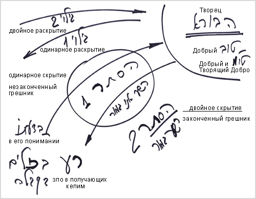 Это называется одинарным скрытием. Здесь он начинает работать. Но почему я сказал, что здесь Творец скрыт? Потому что человек не ощущает, что Творец Добр. Это скрыто от его ощущения. Он ощущает себя плохо. Он не ощущает непосредственно действия Творца, потому что Сам Творец не может ему раскрыться, ведь Он не может раскрыться как приносящий зло. Все эти вещи находятся в скрытии.
