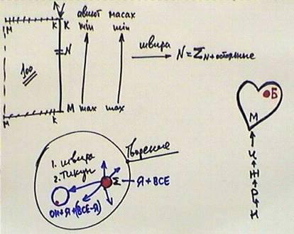 Внутри них находится человек, то есть сердце. Человечка я не рисую – это в наших представлениях мы так себя ощущаем. На самом деле, такого состояния вообще нет. Просто самый низший вид желания представляется нам таким образом - в виде наших тел. Наши желания на чертеже я обозначаю в виде сердца и точки в сердце, то есть разбитого желания.