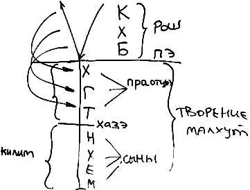 Существует Творец, называемый Кетер, затем следуют хохма, бина – все это считается головной частью, пэ, и относится к рош парцуфа, которая нами не постигается. В ней существует свет Бесконечности, все находится выше малхут. Под пэ находится творение – малхут.
