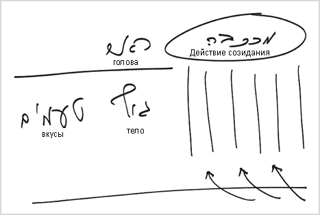 Действие созидания - это высшая система, из которой исходит открытое, а затем скрытое от нижних, управление и руководство всем процессом исправления. Поэтому мы говорим, что эта система относится к науке Каббала, но не является собственно наукой Каббала. Действие созидания - это рош (голова), от которой процесс распространяется вниз и раскрывается нижним. Эта часть называется тело или вкусы. Вкусы раскрываются во всех мирах, включая даже наш мир, из которого мы начинаем пробуждаться благодаря точке в сердце.